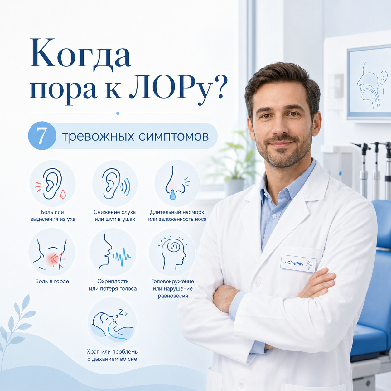 Идти к ЛОР-врачу стоит не только при сильной боли. Поводом для консультации могут быть затяжные, повторяющиеся или необычные симптомы: ухудшение слуха, шум в ушах, заложенность носа, боль в горле, осиплость, головокружение, храп и остановки дыхания во сне.